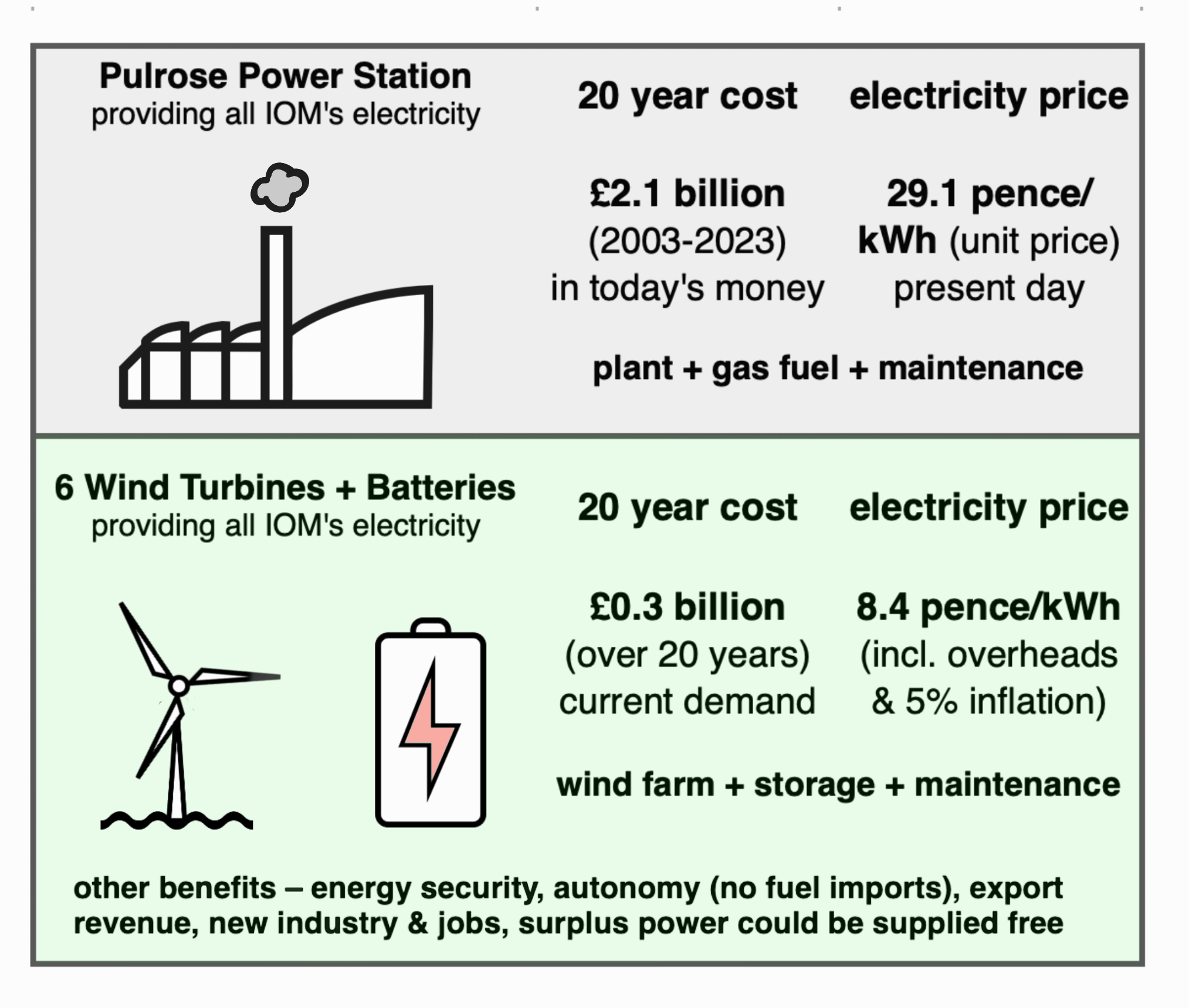 Electricity production has to be flexible to meet fluctuating demand. This is where gas power has served us well. It does, however, come at a price. The cost of Pulrose power station from 2003 (when it was built) to 2023, has been £2.1 billion for plant, maintenance and fuel, including inflation. This equates to an annual cost of £106 million (€120 million) in today’s money and a very high electricity price – 29.1 pence (€0.34) per kWh, including infrastructure expenses and overheads.